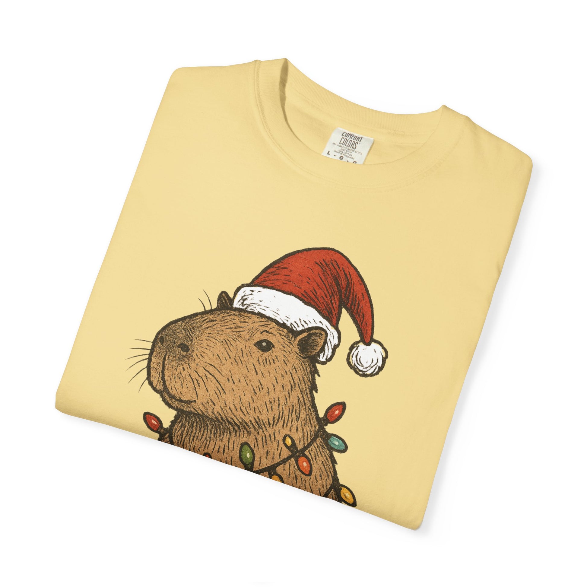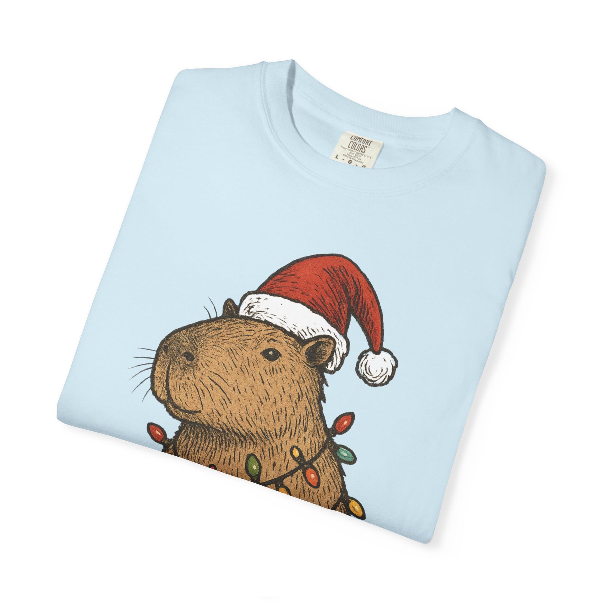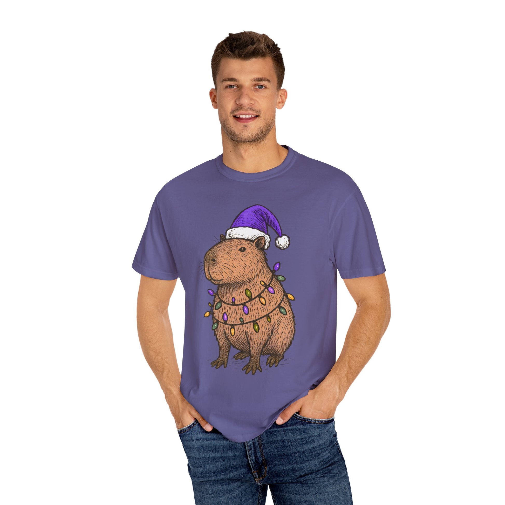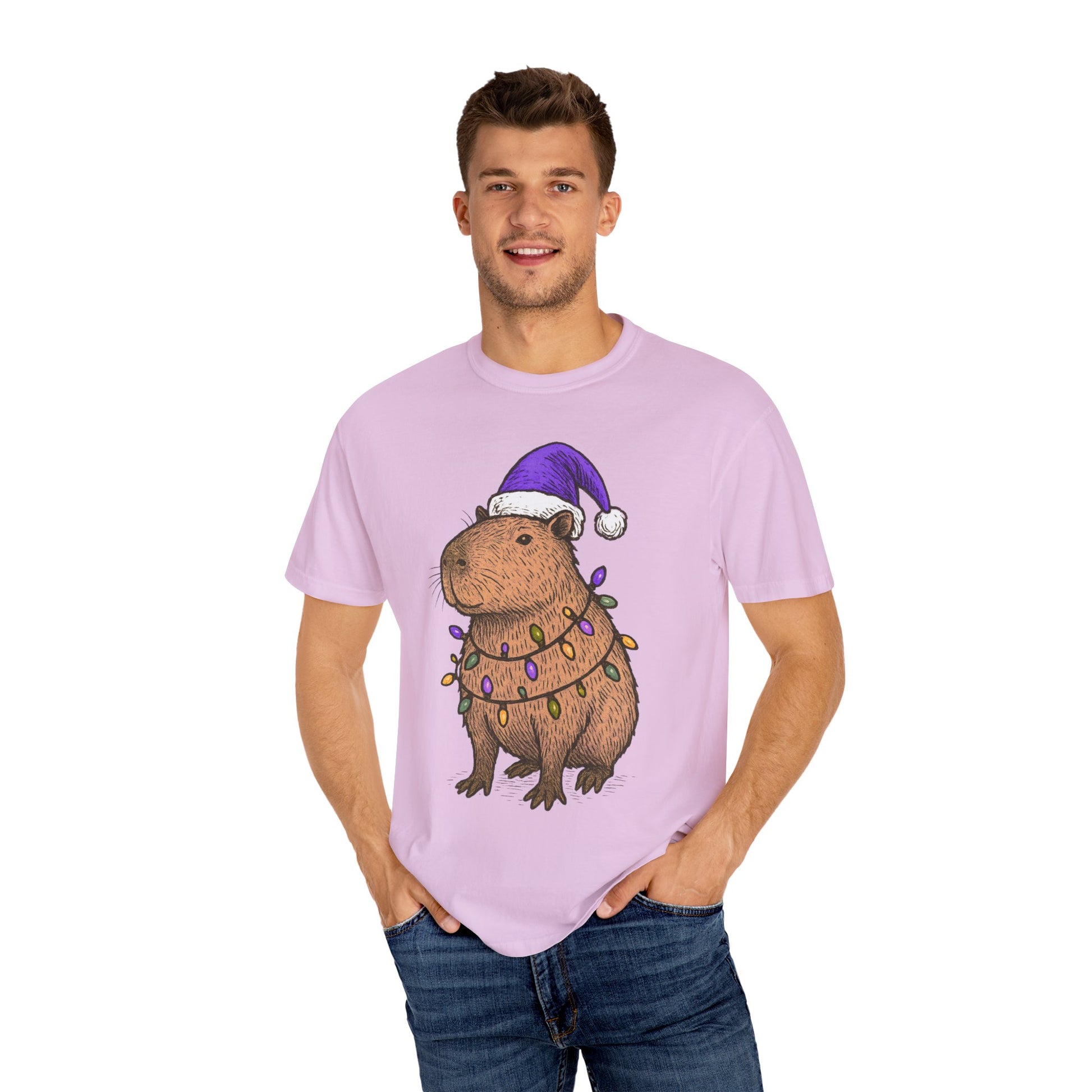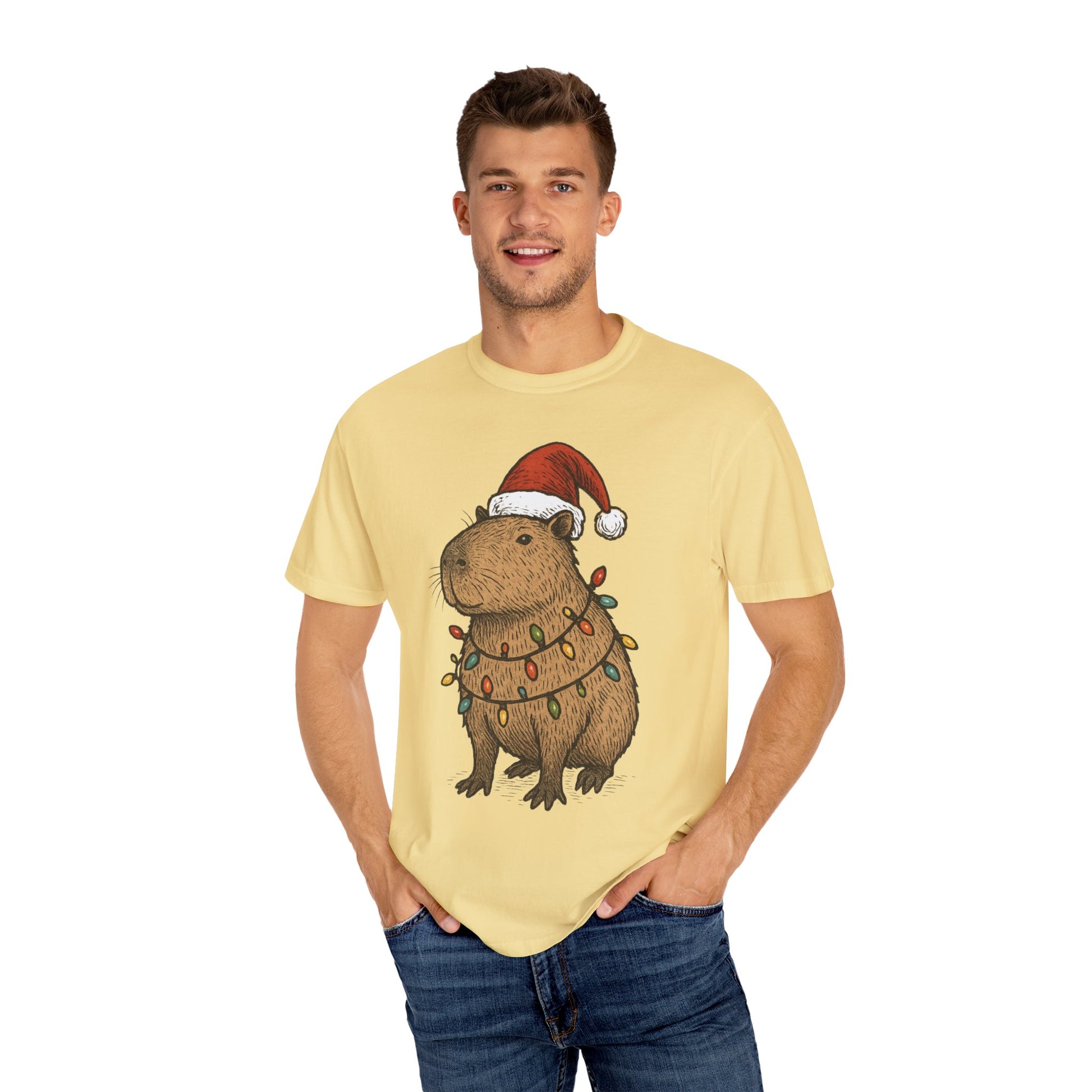 This Christmas capybara T-shirt exudes a festive and playful vibe, perfect for anyone looking to add a touch of holiday cheer to their wardrobe. It's a great gift for animal lovers and those who enjoy unique and quirky designs. Ideal for Christmas celebrations and casual wear during the holiday season.