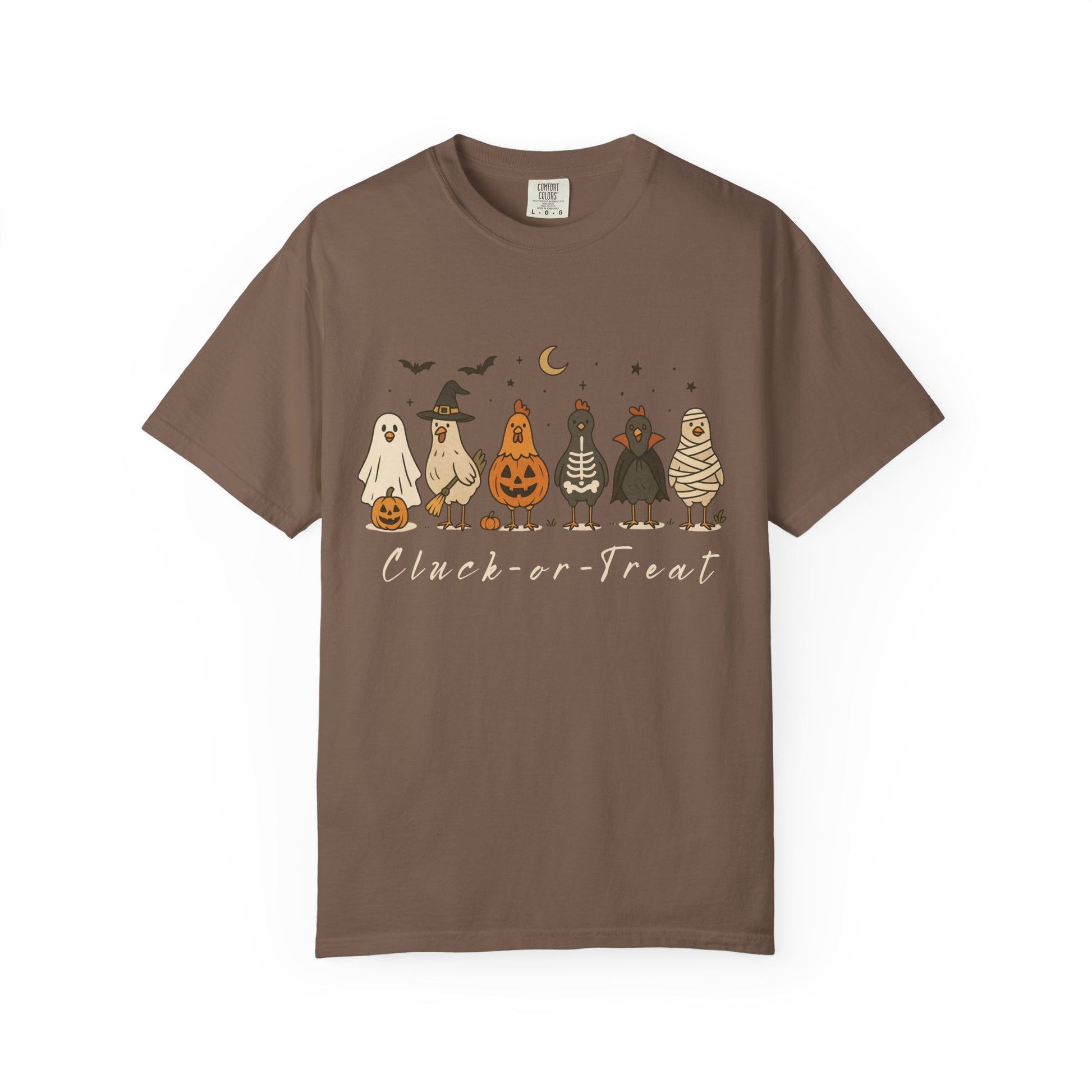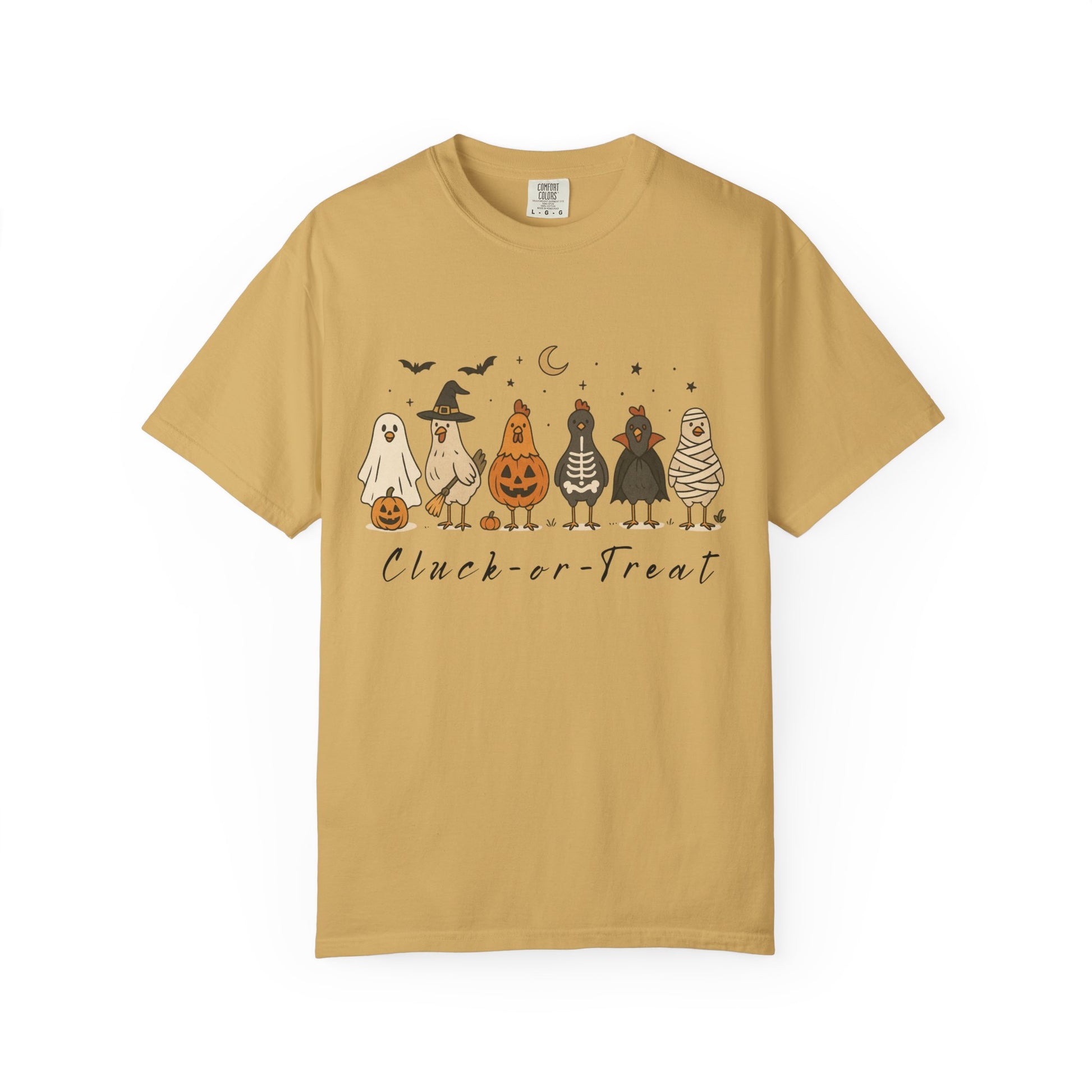 This halloween chicken 'Cluck-or-Treat' T-shirt exudes a fun and festive vibe, perfect for Halloween celebrations. It is relevant to those who enjoy quirky and unique holiday-themed clothing.
