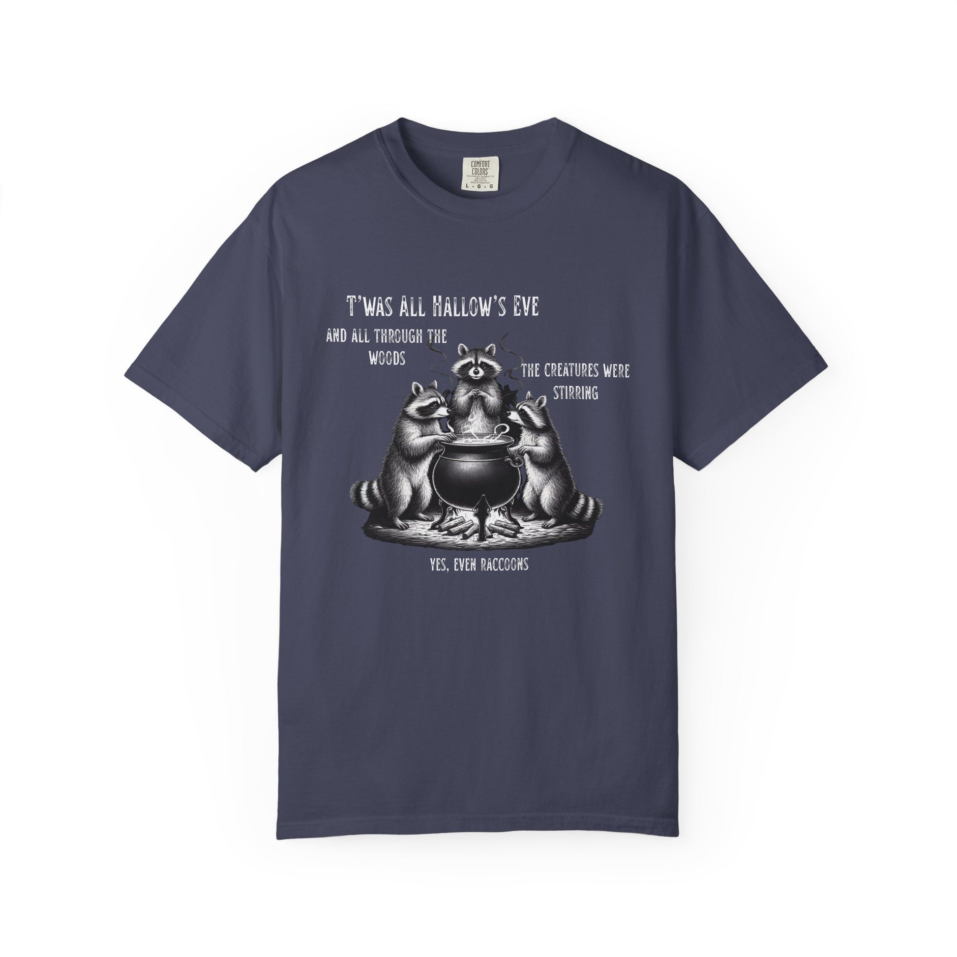 Celebrate all hallow's eve with this raccoon T-shirt. Perfect for those who enjoy a festive and spirited atmosphere. Great for Halloween parties, trick-or-treating, or simply showing off your spooky spirit.
